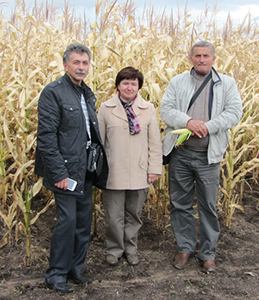 Слева направо: завотделом селекции ВНИИ кукурузы Ю. В. Сотченко, В. Л. Колесникова, главный агроном ВНИИ кукурузы А. М. Чиник