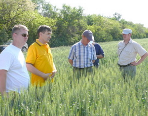 В учхозе ДонГАУ мы осмотрели поля озимой пшеницы, посеянной по различным предшественникам, большей частью – после бобовых культур. Философия совместного выращивания зерновых, подсолнечника и других культур с бобовыми – то, чем занимается Н. А. Зеленский в течение 30 лет – медленно, но с приходом новых сеялок все быстрее продвигается в практику, находит своих последователей. И, на мой взгляд, первые результаты этого перехода мы уже видели воочию, а полнее оценим при получении урожая 2011 года. Очень нагляден был пример с озимой пшеницей, посеянной в люцерну. Мы убедились, что она выглядит даже лучше, чем та, что накормлена химическими азотными удобрениями (на соседнем поле, через лесополосу). Пшеницу посеяли по люцерне трех лет использования, которую «придавили» гербицидом Балерина, 0,2 л/га. Эффект получился замечательный: люцерна находится в нижнем ярусе, а ее отмирающие нижние части являются источником азота для растений пшеницы.