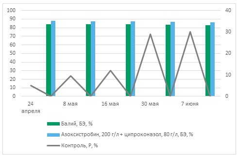 Через 22 дня после двукратной обработки фунгицидами их БЭ против пиренофороза находилась в пределах от 82,6 % до 88,3 %, а разница между Балием и стандартом в развитии болезни составила всего 1,5 % при значительном развитии болезни в контроле без обработки (24,7 %) (график 1).