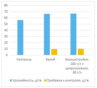 Против мучнистой росы и желтой ржавчины Балий и стандарт показали БЭ 100 % при низком уровне развития заболеваний в контроле. Это продемонстрировало прекрасную работу фунгицидов в связке «иммунитет растения + химическая защита».