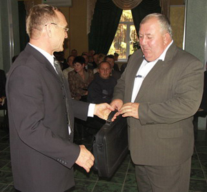 На снимках: выступает В. Я. Сергиенко; В. А. Посемин вручает ноутбук с «КонСором» Н. В. Гарацю.