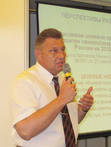 Директор ВНИИСС им. А. Л. Мазлумова Игорь Апасов рассказал о ходе выполнения целевой отраслевой программы развития свеклосахарного подкомплекса России на 2010 - 2012 годы, ставящей перспективной целью достичь самообеспечения сахаром на уровне 85 %. В этом году почти все свеклосеющие регионы расширили площади посева сахарной свеклы на 30 - 40 % и даже больше, а в целом по России свекла посеяна на 1056 тыс. га и рост ее площадей составил 33 %. По самым скромным прикидкам, нынче будет произведено около 33 - 35 млн т корнеплодов.