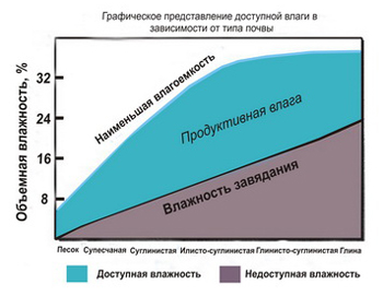 На рисунке 5 графически изображены потенциальные запасы продуктивной влаги в почвах различного механического состава. Важно обратить внимание не только на то, насколько разное значение имеет НВ для разных видов почвы, но и на различия в диапазоне между НВ и влажностью завядания. На глинах и песках этот диапазон очень узок. Именно на таких почвах мы вынуждены поливать часто, поскольку периодические поливы даже при точном расчете поливной нормы будут приводить к тому, что состояние влажности завядания в день перед поливом будет резко сменяться состоянием предельной влагоемкости после него.