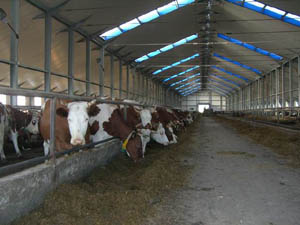 Здания комплекса неотапливаемые, но стены и крыша представляют собой систему «сэндвич» – при толщине в 120 мм по теплоизоляции они соответствуют аналогичной метровой кирпичной стене, поэтому в любое время года здесь поддерживается нормальная температура. Высота помещения – более 9,5 м, за счет этого создается оптимальная для дыхания животных кубатура воздуха, комфортные условия содержания, обеспечивается хорошая вентиляция, и это положительно влияет на продуктивность коров. В доильном зале установлено оборудование немецкой фирмы «Вестфалия», самое распространенное в мире.