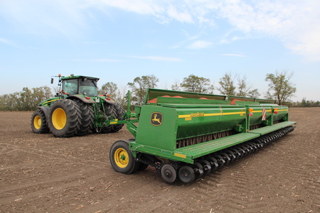 В первые годы всходы не радовали, и мы пришли к выводу, что нужно заменить сеялки. Приобрели машину «John Deere-455». Хотя она тоже механическая, вроде бы работает по тому же принципу, но заменила две старые по производительности, качество несопоставимо! Легко сеет порядка 60 га за смену. Держит давление, точно соблюдает параметры: если задал 4 см, то зерно ляжет именно на эту глубину, не больше и не меньше. Высев настраивается идеально, мы можем высчитать расход с точностью до килограмма. Сеем строго по рекомендациям НЦЗ имени П. П. Лукьяненко для нашей зоны – 4,2 - 4,3 млн семян/га. В результате всходы равномерные, дружные, нет отставания одних растений от других, урожай выше, а люди освобождены для выполнения других работ.
