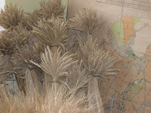 На снимках: Алексей Бобин; знак при въезде в хозяйство; вот такая стояла пшеница в полях (снопы сортов Безенчукский янтарь и Комсомольская 90 в кабинете главного агронома).
