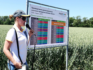 Объезд полей начался с озимой пшеницы сорта Юка, где ведущий менеджер-технолог Краснодарского представительства «Августа» С. В. Кононенко представила систему защита культуры от сорняков. Ранней весной, 20 марта, когда возобновилась вегетация культуры, на посевах применили фунгицид Кредо, чтобы защитить растения от мучнистой росы и прикорневых гнилей.