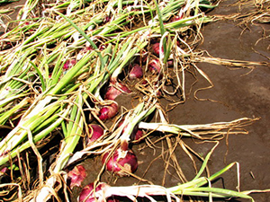 Однако не спешите при этом демонтировать систему капельного полива: бывают ситуации, когда тяжелые или солонцеватые почвы к моменту выкопки лука твердеют настолько, что рабочие органы копалки не могут войти в почву на нужную глубину и повреждают луковицы. В этом случае можно провести небольшой (30 - 35 м3/га ) полив для увлажнения почвы, после чего она станет мягче, и выкопка пойдет быстрее. А чтобы луковица не насытилась водой при этом и не снизила своей лежкости, лучше добавить в поливную воду 15 - 20 кг/м3 фосфорных удобрений. Фосфор не успеет усвоиться луковицами и просто останется в почве поля на следующий год, но повышение ЕС поливной воды (ЕС – электропроводимость; чем она выше, тем труднее растениям впитывать воду, – прим. ред.) помешает излишнему оводнению луковиц. Можно решать эту задачу и калийной солью. А вот азотосодержащие удобрения нельзя использовать для этой операции ни в коем случае, поскольку это приведет к накоплению нитратов в продукции.