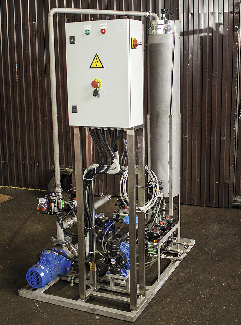 К модулю, в котором установлена аппаратная и программная части, присоединяются емкости для накопления воды и хранения готового раствора. Они могут быть объемом от 10 до 200 м3 – мы разрабатываем систему хранения под заказ клиента. Также здесь предусматривается либо подогрев воды, либо ее очистка или умягчение, действует система циркуляции, потому что есть ряд препаратов, которые без постоянного перемешивания могут выпадать в осадок.