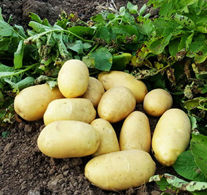 Сорт образует 14 - 16 клубней овальной формы равномерной калибровки со светлой гладкой кожурой, поверхностным залеганием глазков и желтой мякотью.