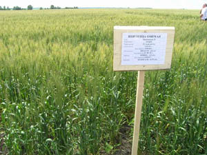 На снимках: Александр Иванович Кочнев на пшеничном поле; одно из полей озимой пшеницы с табличкой, где приведены основные приемы технологии ее возделывания; опрыскиватель «Рау» и сеялка «Рапид» в работе на полях ЗАО «Откормочное».
