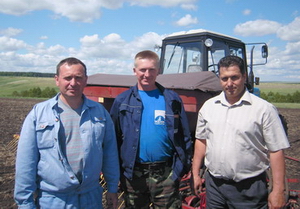 На поле (слева направо): П. Г. Аленин, механизатор агрофирмы А. Б. Мартынов и В. П. Комратов.