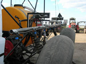Этот агрегат очень удобен на внесении КАС. Двух емкостей по 600 л хватает на 9 - 10 га. А когда нужно вносить минеральные удобрения – снимаем опрыскиватель, ставим бункер на 1 - 1,2 т – и работаем в любую погоду. Гранулированные калийные удобрения он вносит идеально с той же самой скоростью, производительностью, что и на КАС. Разброс – 20 м, но можно и другой режим использовать, сделав перерасчет.