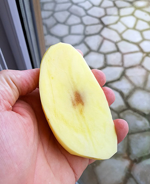 Дуплистость клубней – хрестоматийное последствие водного стресса. Вы можете вылить на поле за сезон совершенно правильное количество воды, но если сам полив будет строиться по принципу «пересыхание – переувлажнение» (что как раз и характерно для полива дождеванием), то такие постоянные водные стрессы приведут к образованию внутри клубней пустот вследствие неравномерного роста клеток паренхимы. Профилактика подобных проблем заключается в тщательном контроле влажности почвы в зоне расположения клубней и проведении частых, но умеренных поливов.