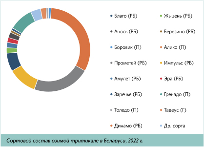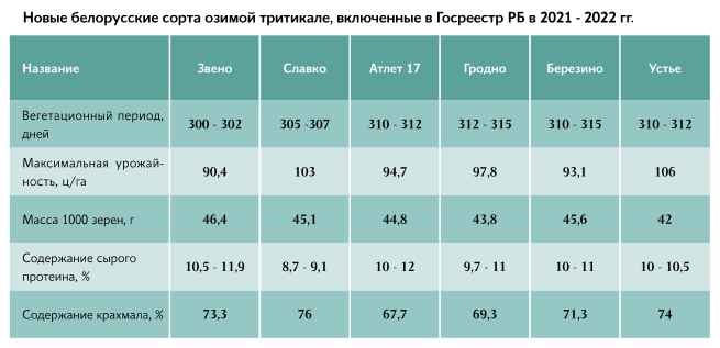 Сегодня более 80 % посевов тритикале в республике занимают белорусские сорта. Самым распространенным и по сей день остается зернофуражный сорт Динамо. Он районирован и в России, а в Беларуси используется в качестве стандарта в Инспекции по испытанию и охране сортов растений. Но несмотря на его отличные качества, Динамо сеют уже более 5 лет, и он устарел. Его место достойны занять выведенные в последние три года сорта: Звено, Славко, Атлет 17, Гродно, Устье, Березино. У каждого из них своя специфика. Так, у Устья и Славко повышенное содержание крахмала – их предпочтительно выращивать для производства спирта. Атлет 17 и Гродно – короткостебельные (90 - 110 мм), а значит, более устойчивые к полеганию, они выдерживают большие дозы удобрений. Потенциальная урожайность всех новых сортов превышает 90 ц/га, а средняя – 60 ц/га зерна. Для белорусской тритикале по сравнению с зарубежной характерны меньшая требовательность к интенсификации и большая устойчивость к болезням. Наши сорта лучше адаптируются к преобладающим здесь видам и расам патогенов.