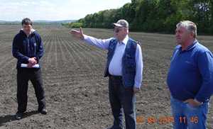 Осмотр всходов сахарной свеклы на хмельницком «поле-онлайн»: академик А. А. Иващенко (в центре), руководитель проекта агроходинга «Мрия» В. М. Нога (справа), региональный агроном холдинга О. Пацура