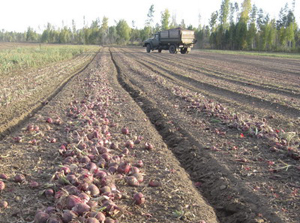 А как дела на луковом «поле-онлайн» в Восточной Сибири, где в знаменитом хозяйстве СХ ОАО «Белореченское» эту культуру выращивает агроном хозяйства и наш региональный консультант Сергей Мирвода? 5 сентября здесь начали уборку лука на неполивных участках. Сначала, как полагается, скосили ботву, потом поработали копателями, которые уложили лук в аккуратные валки, потом на подбор пустили луковый, а также картофельный (с лукоуборочной насадкой) комбайны. Последний метод, по словам Сергея Васильевича, дает отличный результат.