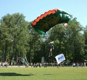 На снимках: А. М. Усков (в центре) и В. В. Свешников вручают награды ветеранам ВЗСП; выступают «августята»; момент футбольного матча; шоу парашютистов.