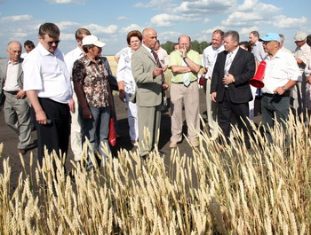 На снимке: академик В. А. Зыкин представляет новые сорта пшеницы.