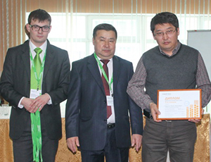 Кокшетау: М. А. Габдулин (с дипломом) с сотрудниками «Августа» В. В. Заляйскалнс и Н. А. Канитаевым