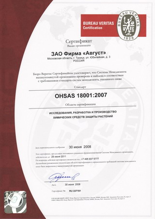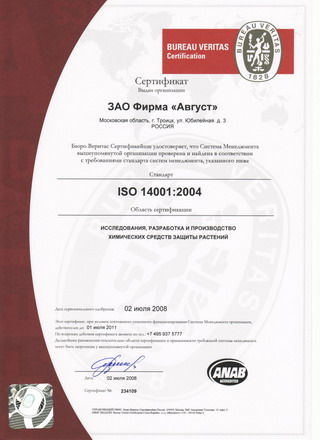 В середине августа фирма «Август» получила сертификаты соответствия Международным стандартам (МС) ISO 14001:2004 и OHSAS 18001:2007 (по экологии и профбезопасности) в дополнение к сертификату ISO 9001:2000, полученному в прошлом году. Это означает, что корпоративная система менеджмента теперь интегрирована по трем международным стандартам.