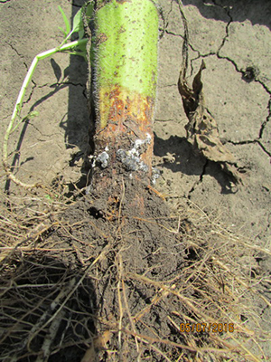 Подземный склеротиниоз сои выглядит так. Например, в сплошном посеве культуры все растения зеленые, а отдельные – мертвые, у них желтый или коричневый стебель. Во влажную, сырую погоду, когда соя смыкается, склеротиния может разрастаться и формировать такие очаги. Но, как правило, это отдельные растения. В разрезе стебля сои минимум через месяц после гибели растения формируются склероции.