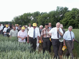 На снимках: А. И. Грабовец с губернатором Ростовской области В. И. Чубом (слева); А. И. Грабовец (с мегафоном) демонстрирует опытные делянки новых сортов пшеницы; поле сорта Северодонецкая юбилейная.