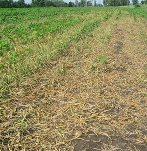 Иногда не получают заданную густоту стояния растений культуры еще и из-за плохой подготовки почвы и чрезмерно глубокой заделки семян. Известно, что семена сои имеют надземное прорастание и выносят подсемядольное коленце семядоли на поверхность почвы. Поэтому недопустима заделка семян на глубину более 7 - 8 см (фото 1), традиционно оптимальная глубина заделки семян – 4 - 5 см. Если мы не получим оптимальной для сорта густоты посева, то все остальные агроприемы по контролю сорняков будут малоэффективны (фото 2).