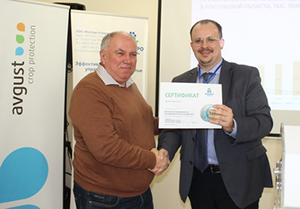 Программа семинара включала много интересных выступлений. Руководитель региональной группы «Августа» в г. Зеленокумске Леонид Мурадханов рассказал о защите посевов озимых колосовых от двудольных сорняков при помощи препаратов Бомба и Плуггер и использовании гербицидов Ластик Топ и Ластик Экстра для борьбы с однодольными. Он указал на сложности защиты гороха от сорных растений и рекомендовал для этой культуры «мягкие» препараты: Корсар и Корсар Супер. Он предложил использовать на зернобобовых и технических культурах противозлаковые гербициды Миура и Квикстеп, которые не обладают фитотоксичностью и негативным последействием в севообороте. Гербициды эффективнее действуют в смеси с адъювантами, которые в зависимости от преобладающего типа засоренности могут быть разными – Аллюр или Галоп.
