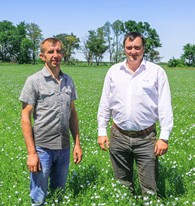 Перед уборкой делаем десикацию Суховеем, 1,7 л/га, к которому добавляем Адью, 0,1 л/га, потому что на некоторых полях, когда лен начинает высыхать, появляется вьюнок, и надо его убрать. Кроме того, это позволяет исключить созревание культуры в одни и те же сроки с озимой пшеницей.