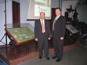 На снимке: слева направо – директоры областных государственных инспекций по семеноводству, карантину и защите растений А. В. Матиевич (Гродненская область) и В. В. Борисюк (Брестская область) у макета нового завода.